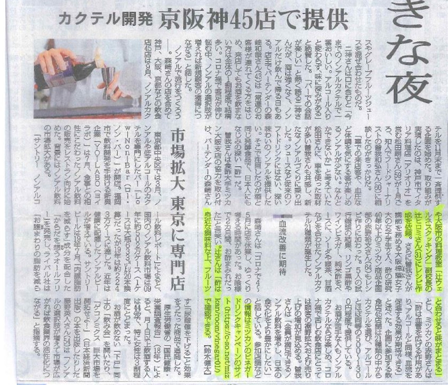 Mizkan&当校辻ヒロミ副校長のノンアルカクテル開発・コラボ記事が、10/8(木)毎日新聞夕刊1面に掲載<クリックで詳細>