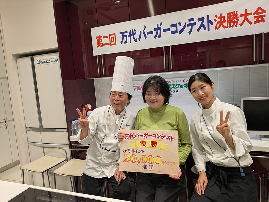 1/7(土)辻󠄀ウェルネスクッキング近鉄あべのハルカス校で、第2回万代ハンバーガーコンテストが開催されました。多くの応募の中から書類審査で、選ばれた6名が決勝大会に出場。6名とも、素晴らしい作品で、審査員泣かせの大会になリましたが。甲乙つけがたい優秀作品が並ぶ中、保科妙子さんのタコスハムカツバ一ガ一が見事優勝、谷内俊介さんのプ一ティン風ハンバーガ一が準優勝に輝きました。万代から表彰状、お買物券、賞品が贈られました。お二人の作品は、さらに磨きをかけて、3月頃に万代で商品化される予定です。審査員の林教授、辻󠄀ヒロミ校長から、創意工夫を凝らし、作品を仕上げたお二人に、その栄誉が讃えられました。